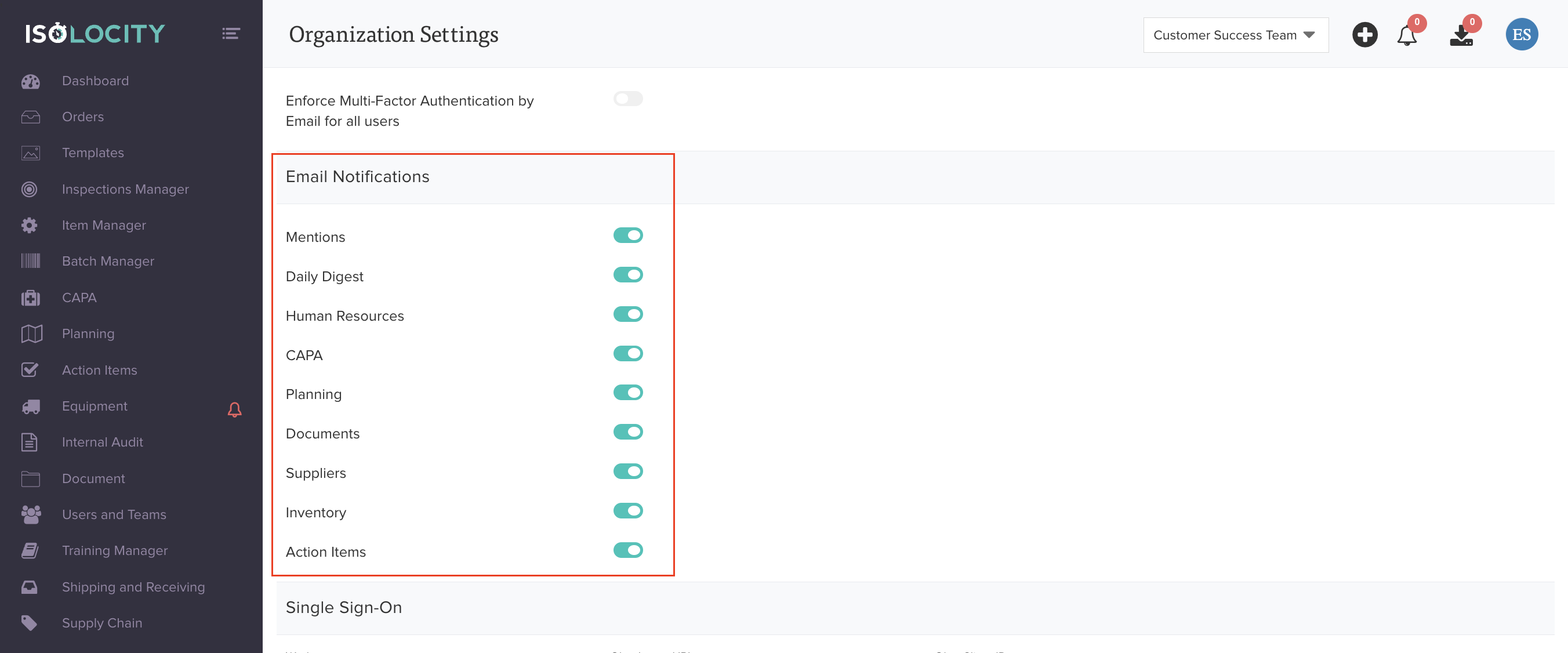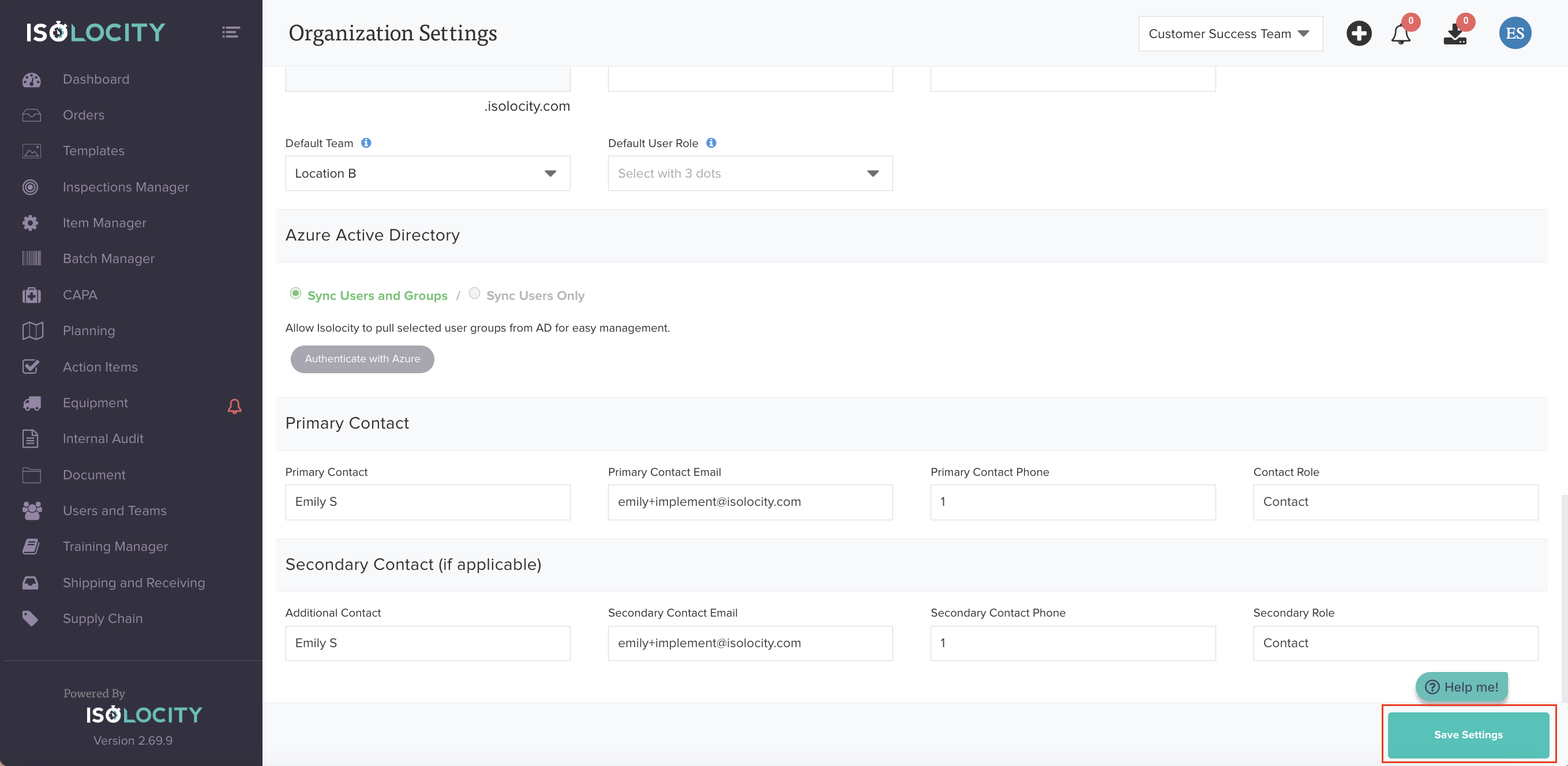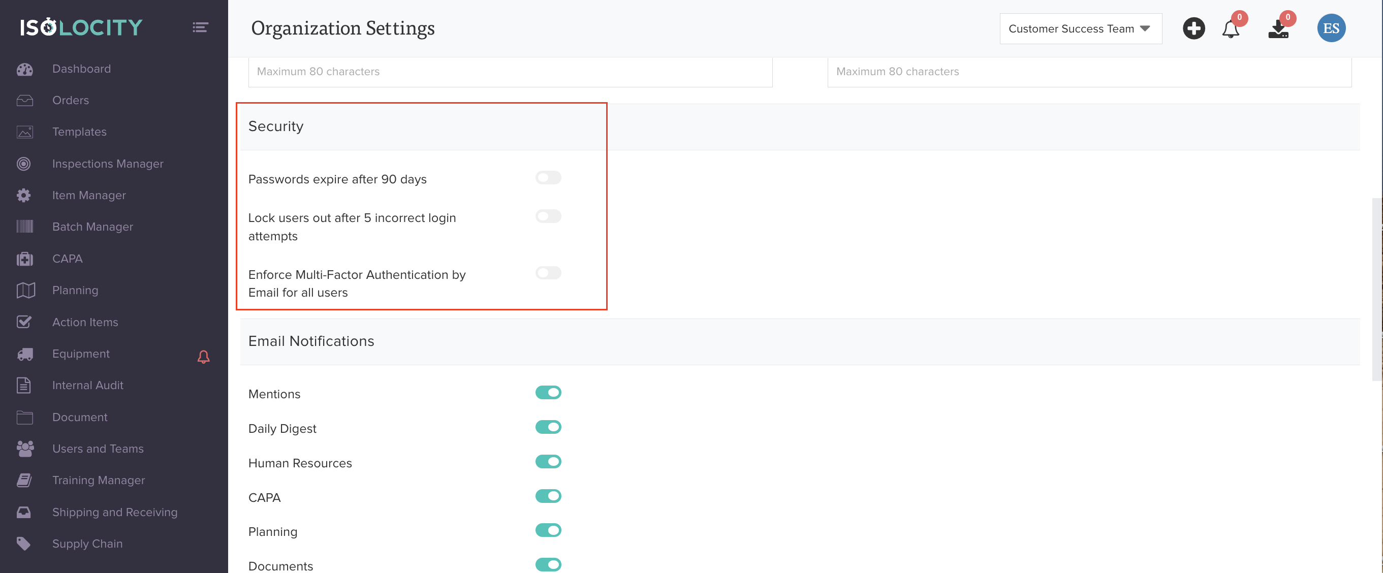 Adjust your Organization Settings to strengthen and customize how security features are managed in Isolocity. Available options include: