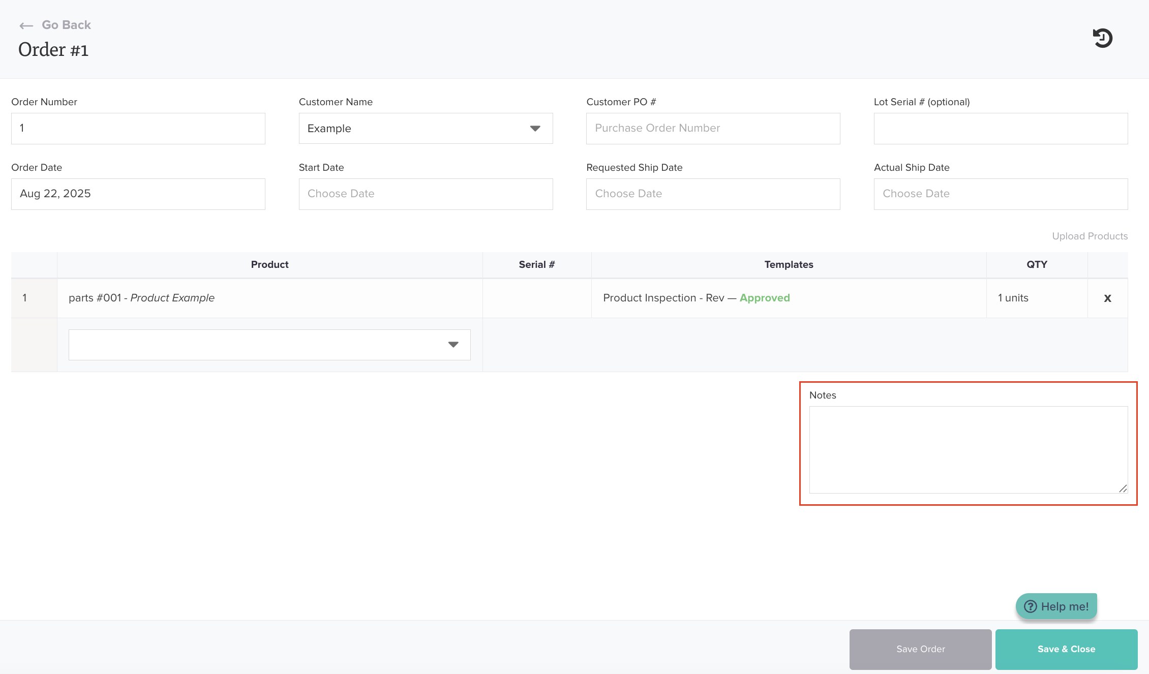 - Lot Serial # (optional) - only use this field if all the parts in the order have the same Lot Serial #